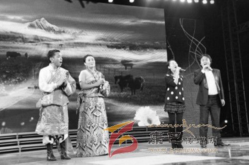 雙流節(jié)目中最有亮點的是川劇《人間好》和《水龍吟·黃龍溪街市》。和藏戲一樣,川劇是中國戲曲寶庫中的一顆光彩照人的明珠,唐代便有“蜀戲冠天下”的說法。今天,川劇《人間好》與《巴塘藏戲》先后登場,展現(xiàn)了雙巴兩地對非遺文化的傳承精神?!度碎g好》用高腔、胡琴、昆腔、燈戲、彈戲五種聲腔,表達了人們對美好生活的歌頌與向往。意味雋永的唱腔,引人入勝的表演,幽默風趣的唱詞,充滿鮮明的地方色彩和濃郁的生活氣息。最令觀眾感興趣的是,具有象征意義又妙趣橫生的川劇臉譜與粗獷而富有民族特色的藏戲臉譜交相輝映,不經(jīng)意間反映出了本次活動的主題:感恩、互助、團結(jié)?!端堃?middot;黃龍溪街市》節(jié)目以川劇特技變臉將觀眾引入場景,把舞臺寫意與生活再現(xiàn)結(jié)合,著意淡化了純粹歌舞性表演和拼盤式集合,歌舞、戲曲、技藝等各種川派文化意象配合現(xiàn)代聲音和光電技術(shù),抽象而集中地展示了黃龍溪的茶文化、酒文化、卜筮文化,美人、美酒、美茶、美詩、美景,流溢出濃濃的川味,演員和觀眾在歷史的長河中穿梭往來。