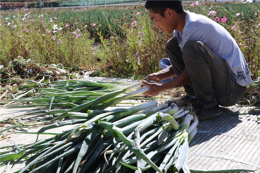 筆者看到,充翁格美熟練地先用鏟子從田地的側(cè)面挖下去2寸深,將大蔥拔出來撣去根須的泥土,然后將斷根的、中等的、大的大蔥分別堆放,每15斤左右打捆,每10捆過稱后搬運(yùn)裝車。據(jù)他介紹,現(xiàn)在基地的大蔥每周要裝兩次車,每次裝10噸。