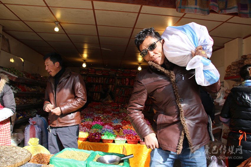 走進(jìn)郭達(dá)橋重康糖果店,洛讓說:“多買點(diǎn)糖果糕點(diǎn),娃娃老婆喜歡?!比缓笳諉吸c(diǎn)貨:花生10斤、瓜子5斤、葡萄干5斤、水果糖5斤、軟糖5斤、炒米糖10斤……一下就指點(diǎn)了八九種糖果糕點(diǎn)??吹搅诉@樣的生意,老板樂開了花。與洛讓大包大攬的氣派不同,長期經(jīng)商的扎西老練地詢價:“老板,我們買這么多,要優(yōu)惠喲。”一番討價還價之后,洛讓和扎西買了十種糖果,用去1066元,裝滿整整兩編織袋。洛讓把糖果過扛在肩上,對筆者說:“你來試一下,有點(diǎn)分量,你別說,辦年貨也是一種體力活喲。”