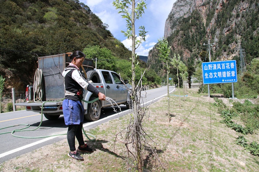 植樹容易,保持存活率很難。“植樹植樹,一分栽九分管。我們植樹造林不只看數(shù)量,更注重質(zhì)量,注重栽植方法和科學(xué)的后期養(yǎng)護(hù)管理,保證樹木的成活率?!?/span>6月11日,在白玉縣絨蓋鄉(xiāng),長江造林局駐白玉管護(hù)站站長梁榮忙著進(jìn)行現(xiàn)場管護(hù)技術(shù)指導(dǎo),“把遮陽網(wǎng)裹緊點(diǎn)、把刺巴綁緊點(diǎn),以免牛和馬啃皮子;水要澆透,不然水分不夠,樹子一斷水,再想‘返陽’就難了;護(hù)欄水泥樁要栽牢,不然牛馬一撞就倒了……”。