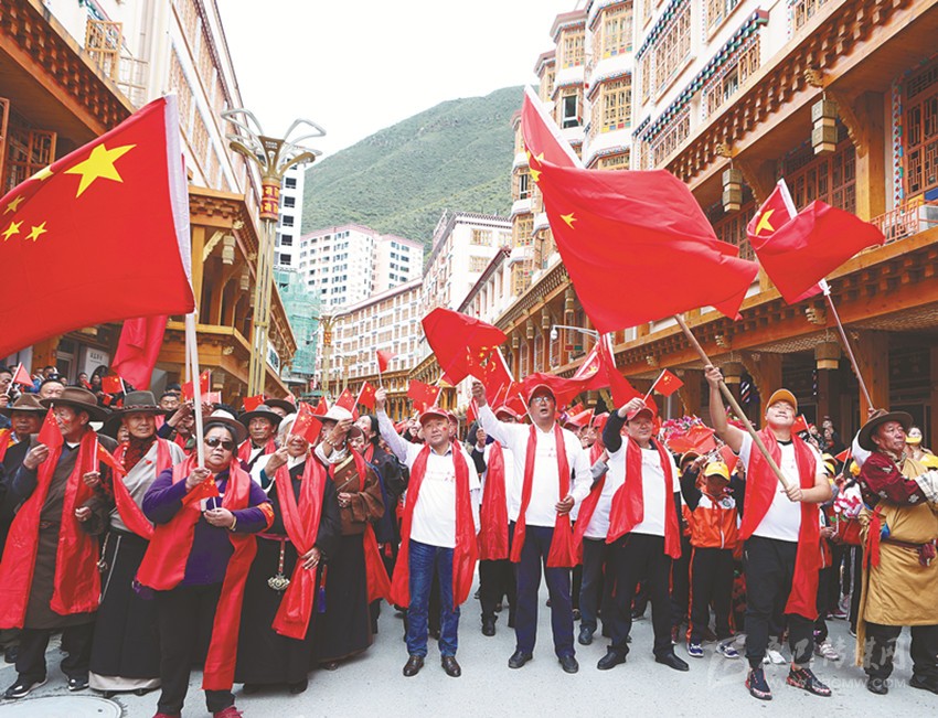 伴隨著悠揚(yáng)的旋律,在當(dāng)?shù)馗袼_爾藝術(shù)團(tuán)演員的帶領(lǐng)和感染下,幾千名當(dāng)?shù)馗刹咳罕娚碇A服,揮舞著手中的五星紅旗,懷著無比激動(dòng)的心情獻(xiàn)歌祖國,同唱《我和我的祖國》。深情激昂的歌聲感染到在場的每一個(gè)人,有的高呼喝彩、有的熱淚盈眶,齊聚在鮮紅的國旗下,齊聲高喊:“我愛祖國,祖國萬歲!”