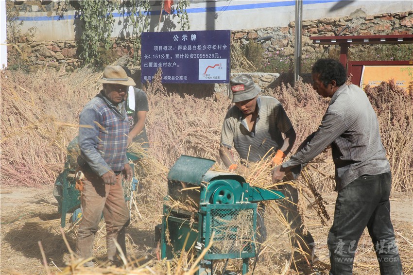 金秋的陽光熾熱溫暖,得榮縣白松鎮(zhèn)奪松村一片祥和安寧。11月10日,村民們正在村活動室的院壩里脫粒藜麥,豐收的喜悅寫在忙碌的村民的臉上?!按蠹壹佑透?,把藜麥交給公司,立馬可以拿到現(xiàn)錢?!眾Z松村委會副主任四郎都遷高興地說,盤點(diǎn)收成,今年又是一個豐收年。