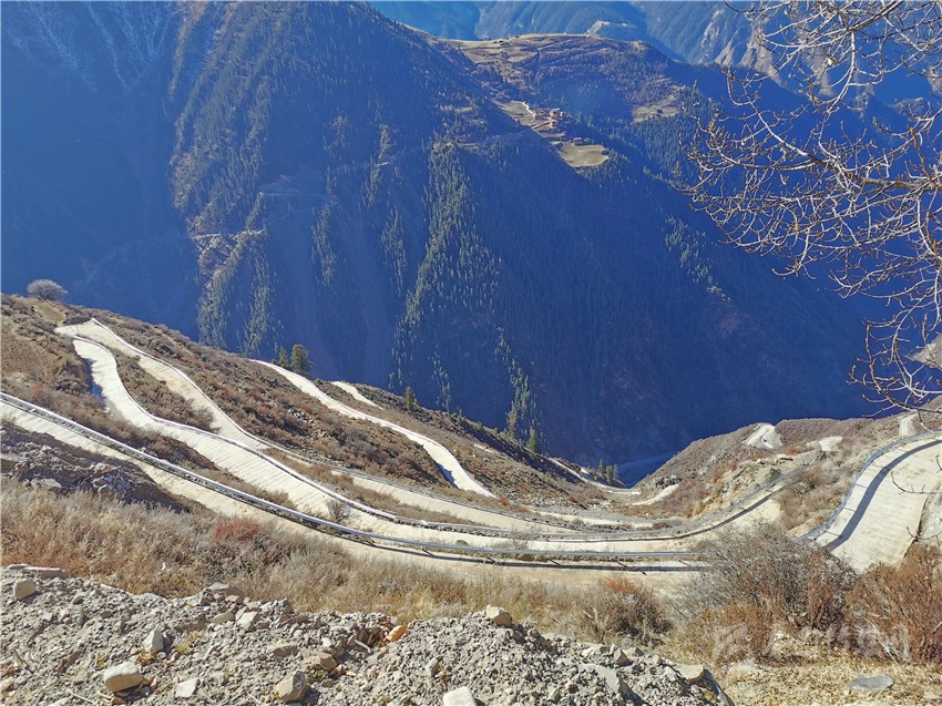 “然布村通村路路面寬4.5米、長(zhǎng)7227米,總投資1084萬(wàn)元?!毙慢埧h交通局工程師唐世楊介紹說(shuō),“整條路有數(shù)十個(gè)急彎道,比山路十八彎還復(fù)雜險(xiǎn)峻,可以說(shuō)是新龍縣最為‘陡、險(xiǎn)、 急’的山路?!?/p>