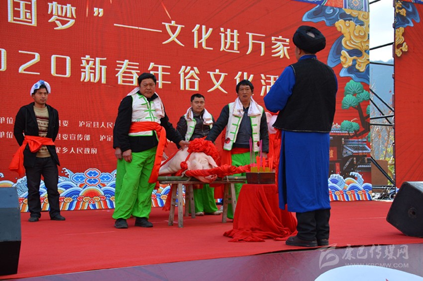 1月11日上午,“瀘定縣2020新春年俗文化活動”在杵坭鄉(xiāng)櫻桃廣場舉行。每到冬月以后,殺年豬這一習(xí)俗總會讓濃濃的年味彌漫在瀘定縣。隨著鑼鼓聲回蕩山間田野,人們歡天喜地,抬著“豬王”一路舞獅打鼓,在人潮的簇?fù)硐聛淼街魑枧_進(jìn)行祭祀。這樣的習(xí)俗,不僅充滿了年味,更是淳樸鄉(xiāng)情和美好寓意的延續(xù)。