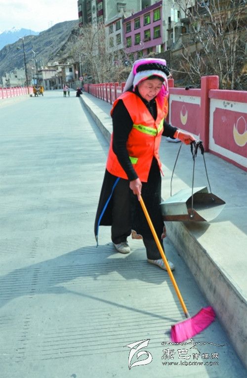 仁青志瑪,50余歲,來(lái)自丹巴縣一座偏僻的小山村。2012年4月,仁青志瑪從老家來(lái)到丹巴縣章古鎮(zhèn)當(dāng)了一名環(huán)衛(wèi)工人,當(dāng)時(shí)每月工資只有800元,除了國(guó)家法定假日能得到雙倍工資外,從來(lái)沒(méi)有星期天。她負(fù)責(zé)的衛(wèi)生區(qū)域在丹巴縣城濱河路上,全長(zhǎng)500余米,由于過(guò)往車(chē)輛多,而且行人較多,每天要產(chǎn)生許多垃圾,因此打掃衛(wèi)生的難度極大,為了給過(guò)往的車(chē)輛及行人留下好的印象,仁青志瑪大姐每天在這500余米的路上來(lái)來(lái)回回的要掃很多遍。