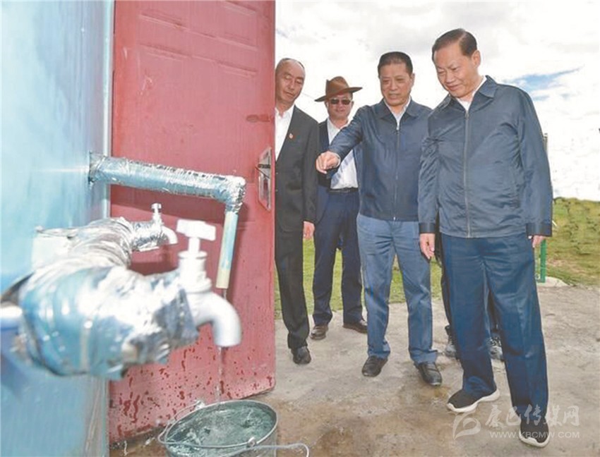 2020年6月15日,四川省委書(shū)記彭清華(右一)赴石渠縣查看包蟲(chóng)病防治安全飲水建設(shè)、管理、使用情況,州委書(shū)記劉成鳴(右二)陪同。