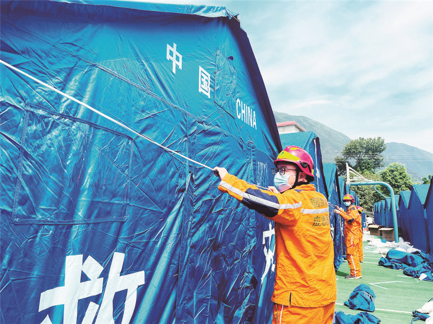 9月8日,當救援隊伍陸續(xù)離開磨崗嶺村的時候,一頂頂藍色的帳篷已經(jīng)搭建完畢,村民們已經(jīng)全數(shù)搬進救災帳篷。記者獲悉,后續(xù)救援物資將通過被搶通的道路陸續(xù)運抵村子。