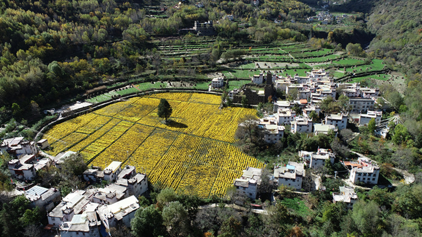 本網(wǎng)訊 金秋時節(jié),在丹巴縣巴底鎮(zhèn)邛山村的一片田地里,當?shù)剞r(nóng)戶正在金絲皇菊基地里采摘菊花。35畝金絲皇菊迎風綻放,成為當?shù)孛利惖娘L景。今年,該村采取“公司+合作社+農(nóng)戶”因地制宜種植金絲皇菊,讓群眾在家門口就業(yè),菊花種植產(chǎn)業(yè)打造了綠色生態(tài)美麗鄉(xiāng)村,吸引了不少游客前來游玩,成為當?shù)厝罕娭赂辉鍪盏男侣纷印?/span>降初澤郎 吉靜 洛桑達瓦/文