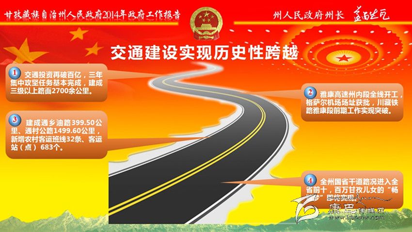 交通建設(shè)實(shí)現(xiàn)歷史性跨越。交通投資再破百億,建成三級以上路面2700余公里。雅康高速州內(nèi)段全線開工,格薩爾機(jī)場場址獲批,川藏鐵路雅康段前期工作實(shí)現(xiàn)突破。建成通鄉(xiāng)油路399.5公里、通村公路1499.6公里,新增農(nóng)村客運(yùn)班線32條、客運(yùn)站(點(diǎn)) 683個。全州國省干道路況進(jìn)入全省前十。徹底告別無電鄉(xiāng)歷史。完成投資100億元,“電力天路”等項(xiàng)目順利實(shí)施,“川藏聯(lián)網(wǎng)” 工程提前半年建成投運(yùn);18個縣實(shí)現(xiàn)與主網(wǎng)連網(wǎng);“遠(yuǎn)村點(diǎn)亮”全面完成。城鄉(xiāng)面貌煥然一新。堅(jiān)持建好縣城,全州市政基礎(chǔ)設(shè)施有效提升。堅(jiān)持做大集鎮(zhèn),改造小城鎮(zhèn)危舊房1118戶;投入1.34億元完善姑咱、馬尼干戈、香格里拉、八美4個省級“百鎮(zhèn)試點(diǎn)”鎮(zhèn)市政設(shè)施,13個鄉(xiāng)獲準(zhǔn)撤鄉(xiāng)建鎮(zhèn)。堅(jiān)持做美村寨,成功創(chuàng)建45個省級“美麗鄉(xiāng)村”示范村,19個州級幸福美麗新村試點(diǎn)建設(shè)全面啟動,打造新村聚居點(diǎn)235個,建成藏區(qū)新居1.11萬戶。全州城鎮(zhèn)化率達(dá)到27%。通信覆蓋越來越廣。完成投資4.53億元,國省干線和主要旅游景區(qū)通信網(wǎng)絡(luò)實(shí)現(xiàn)連續(xù)覆蓋。生態(tài)底色更加鮮明。編制完成《甘孜州生態(tài)文明建設(shè)規(guī)劃》,落實(shí)國家生態(tài)功能區(qū)轉(zhuǎn)移支付資金6.8億元,生態(tài)保護(hù)與建設(shè)工程加快推進(jìn),草原植被、森林覆蓋率分別達(dá)到78%、33.04%。
