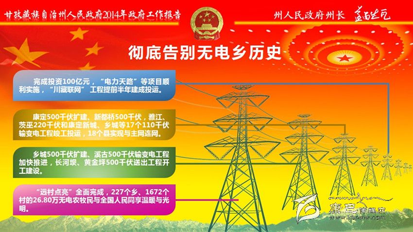 大力推進(jìn)電力通信建設(shè)。投入20億元,加快實(shí)施“電力天路”、無電地區(qū)電力建設(shè)新增項(xiàng)目和農(nóng)網(wǎng)改造升級工程,切實(shí)緩解邊遠(yuǎn)地區(qū)群眾缺電問題;完成長河壩電站500千伏等3個輸變電項(xiàng)目;統(tǒng)籌抓好表后入戶工程,確保群眾安全用電。投入6億元,新建通信光纜2360公里、基站1025個,解決國省干道、旅游景區(qū)景點(diǎn)信號盲區(qū);新增30個自然村通電話、545個行政村通寬帶,出口總帶寬達(dá)到82G。
