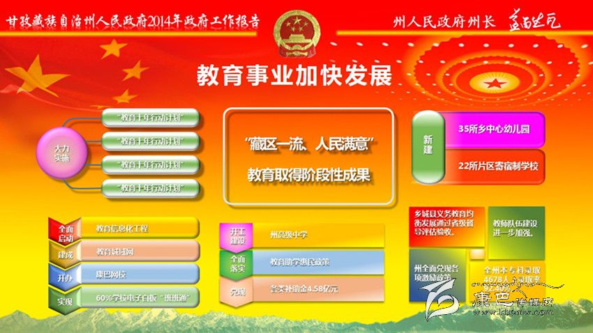 加大民生投入,全年民生支出139億元。全州城鎮(zhèn)新增就業(yè)7400人,城鄉(xiāng)低保實(shí)現(xiàn)應(yīng)保盡保;在全省民族地區(qū)率先實(shí)施醫(yī)療保險制度城鄉(xiāng)統(tǒng)籌,異地就醫(yī)即時結(jié)算全面啟動;在全省率先出臺大病醫(yī)療保險規(guī)定。教育事業(yè)加快發(fā)展。新建35所鄉(xiāng)中心幼兒園、22所片區(qū)寄宿制學(xué)校,州高級中學(xué)開工建設(shè)。全面落實(shí)教育助學(xué)惠民政策,兌現(xiàn)各類補(bǔ)助金4.58億元。城鄉(xiāng)居民基本醫(yī)保參保率達(dá)到99.13%,健康檔案建檔率達(dá)到92%;開工建設(shè)120個標(biāo)準(zhǔn)化鄉(xiāng)(鎮(zhèn))衛(wèi)生院和225個村衛(wèi)生室;衛(wèi)生信息化建設(shè)一期工程和遠(yuǎn)程會診、教學(xué)系統(tǒng)建設(shè)基本完成;兌現(xiàn)計(jì)劃生育“三項(xiàng)惠民制度”資金1809萬元。群眾文化生活日益豐富。建成縣“兩館”12個;開工建設(shè)州民族體育館、州農(nóng)牧民演藝培訓(xùn)中心和14個縣級全民健身中心,建成農(nóng)民體育健身工程739個;開展 “送文化下鄉(xiāng)”近千場;康巴文化研究院“四大工程”全面啟動。深入實(shí)施“百千萬康巴英才工程”,人才科技工作扎實(shí)有效。扶貧移民工作成效明顯。完成1360個貧困村、19.91萬扶貧對象立卡建檔工作;實(shí)施整村推進(jìn)63個、連片開發(fā)項(xiàng)目4個、彝家新寨(村)17個、索改橋23座,易地扶貧搬遷9850人,2.65萬群眾生產(chǎn)生活條件得到改善。