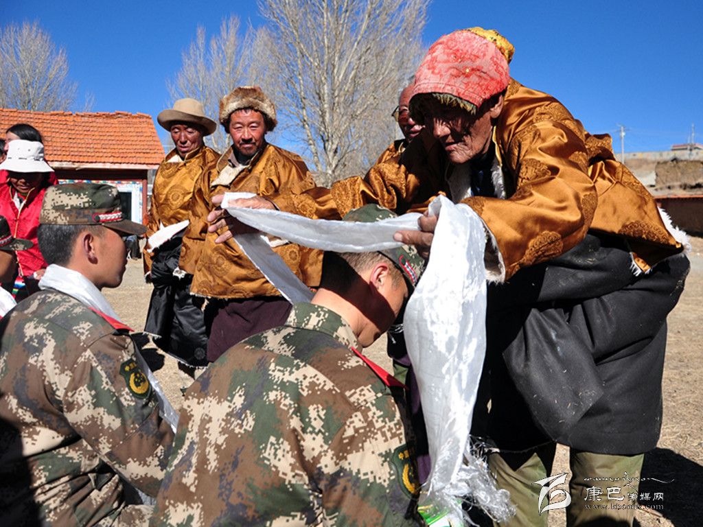 春節(jié)期間,理塘縣敬老院老人為前來慰問的官兵獻哈達。