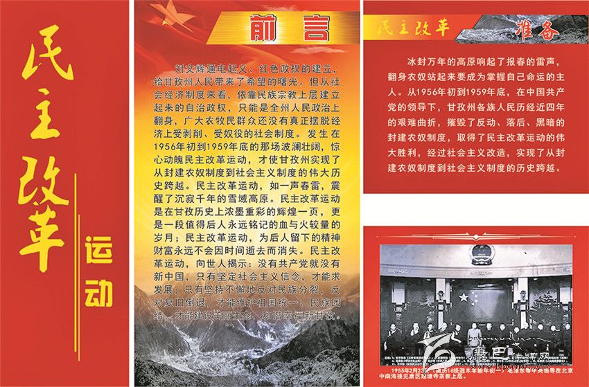 《甘孜州檔案館愛國主義教育基地》的整個展覽分為四大板塊。第一部分命名為“自治政權(quán)的建立”,向參觀者介紹了甘孜藏族自治州誕生的歷史過程;第二部分是“民主改革運動”,把人們帶回了那段不能忘記的烽火歲月;第三部分是“社會主義建設(shè)”,深情地回顧了在建設(shè)社會主義事業(yè)中我州所取得的不平凡的成就;第四部分是“改革開放”,讓人們重溫了在改革開放的大潮中所經(jīng)歷的那些充滿激情的經(jīng)歷。