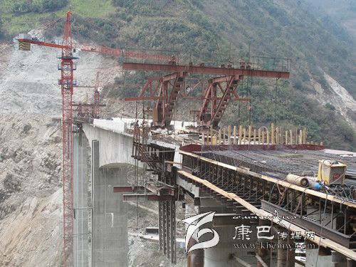 3月12日上午,記者在大崗山水電站S211復建公路工程(瀘石路)B標段跨徑為296米的大渡河大橋(又名灣東大橋)的施工現場看到,高聳的吊裝機隆隆作響,T梁上鋼筋林立;戴著安全頭盔的施工人員正在精心“編織”鋼筋網陣,掛籃懸臂也同時在澆筑施工,大橋已初具雛形。連接大橋的聯合村隧道內,同樣一派忙碌的場面,挖掘機、運輸車等各類工程車往來進出,施工便道上馬達聲轟鳴;正在洞口緊張焊接的鉆孔臺架上劃出一道道閃亮的弧線;隧道內燈火通明,工人們正有條不紊地在洞壁上鉆孔……