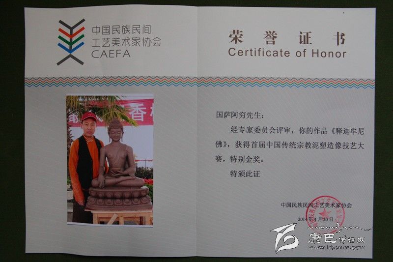 由中國民族民間工藝美術家協(xié)會主辦的“首屆中國宗教泥塑技藝大賽”,旨在傳承宗教泥塑造像技藝,搭建宗教造像藝術家展示平臺。本次大賽共有來自臺灣、香港、天津、河北、四川、西藏、云南、浙江、江蘇、貴州、江西、寧夏、江西等地的39名泥塑高手現(xiàn)場制作,角逐獎項。我州的國薩阿窮等三名藝人現(xiàn)場制作的泥塑作品《釋迦牟尼》榮獲特別金獎,同時,國薩阿窮還榮獲了“中國傳統(tǒng)工藝美術大師(宗教雕塑)”榮譽證書。