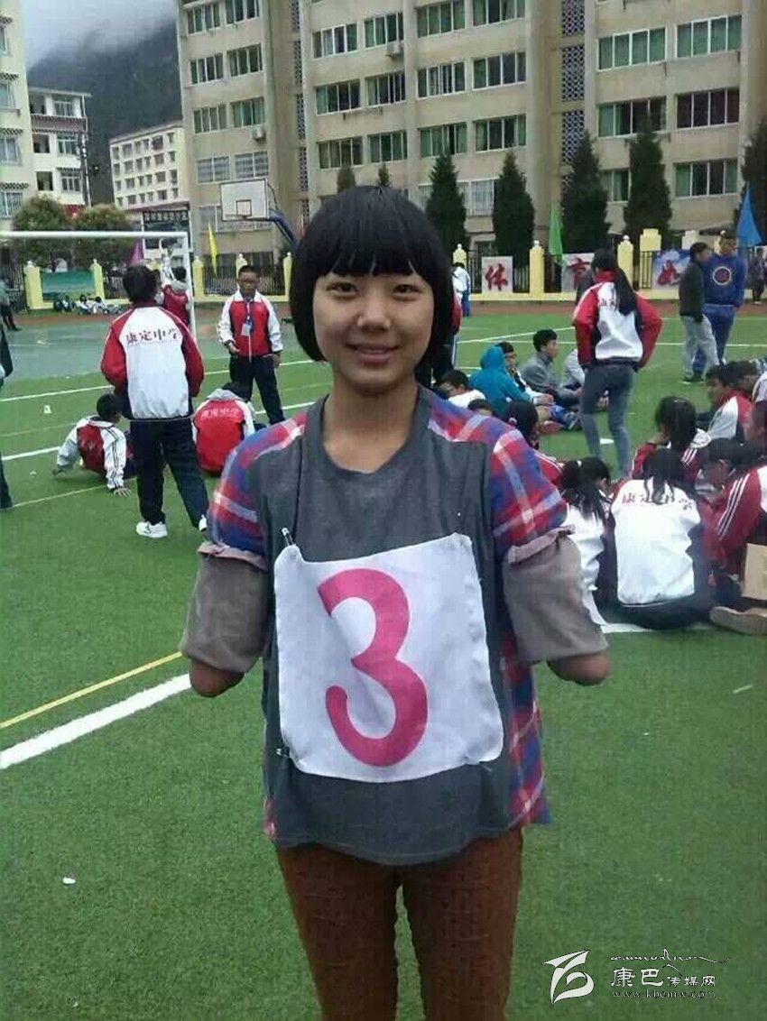 在康定中學(xué)校園里,你會邂逅這樣一位女孩:臉上永遠燦爛著陽光般的微笑,雙眼永遠閃爍著自信樂觀的光芒。教室里,她聚精會神地聽課;圖書館里,她專心致志地讀書;操場上,她身輕如燕地奔跑;寢室里,她開心爽朗地和同學(xué)交流。可你仔細一看,她竟然沒有雙臂,就像折翼的天使。她就是該校高2016屆8班學(xué)生,羌族女孩許方燕。行走在高原的風中,她是一幀讓每一個人內(nèi)心泛起感動漣漪的美麗風景……