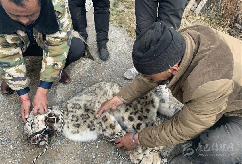 不放心受傷雪豹的隊員們隨即將發(fā)現(xiàn)的情況按屬地管理原則上報了該鄉(xiāng)黨委政府,聯(lián)系了行業(yè)主管部門林草局,并上報縣委縣政府,縣委政府主要領(lǐng)導高度重視要求鄉(xiāng)黨委政府和林草局賡即組織人員再到現(xiàn)場附近搜尋受傷雪豹看是否需要救治。當一行人再次來到現(xiàn)場,發(fā)現(xiàn)受傷的雪豹可能由于舍不得“獵物”去而復(fù)返正趴在巖羊旁,也可能由于傷情見人前來并未離去。大家在簡單商議后,決定先由獸醫(yī)為雪豹現(xiàn)場查驗傷勢。為防止雪豹傷人,在大家的配合下做出必要的防護措施后,開始為雪豹查驗傷勢,經(jīng)查驗發(fā)現(xiàn)該雪豹左前肢和左后肢均被咬傷,其中左前肢受貫穿性咬傷,傷勢較重,造成其無法行走,隨即大家決定將雪豹帶回救治。