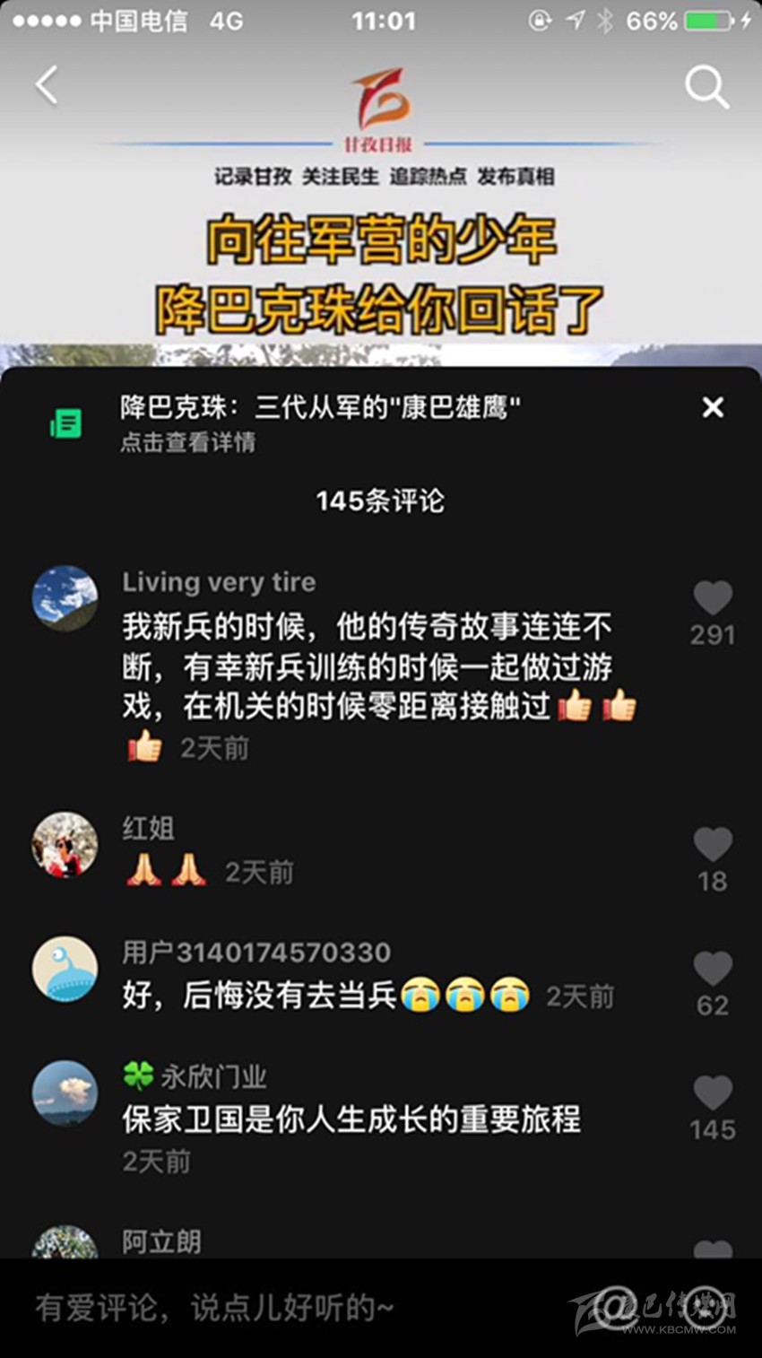 三段視頻,六百多條留言,近兩千萬次播放,一個藏族少年的軍旅夢在網(wǎng)絡(luò)上熱烈綻放,而農(nóng)牧區(qū)許多青年的軍旅夢也就此被點燃,忠勇大愛的“血脈”在康巴高原傳承! (本網(wǎng)記者 肖宵 整理)