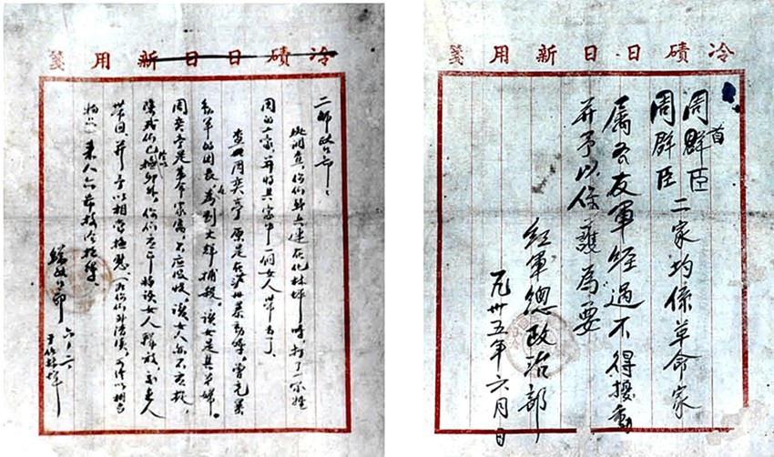 1935年6月2日,劉伯承同志寫給2師政治部的信。周奕庭是劉伯承順、瀘起義部隊的團(tuán)長,起義失敗后轉(zhuǎn)入地下,1932年在成都被捕后遇害。紅2師先頭部隊抵達(dá)化林坪時錯將其家屬當(dāng)作 “土豪”,抓走其弟媳。劉伯承同志為此給2師政治部寫信,說明其家為革命烈屬。其弟媳很快得到釋放,其家屬也得到了保護(hù)。