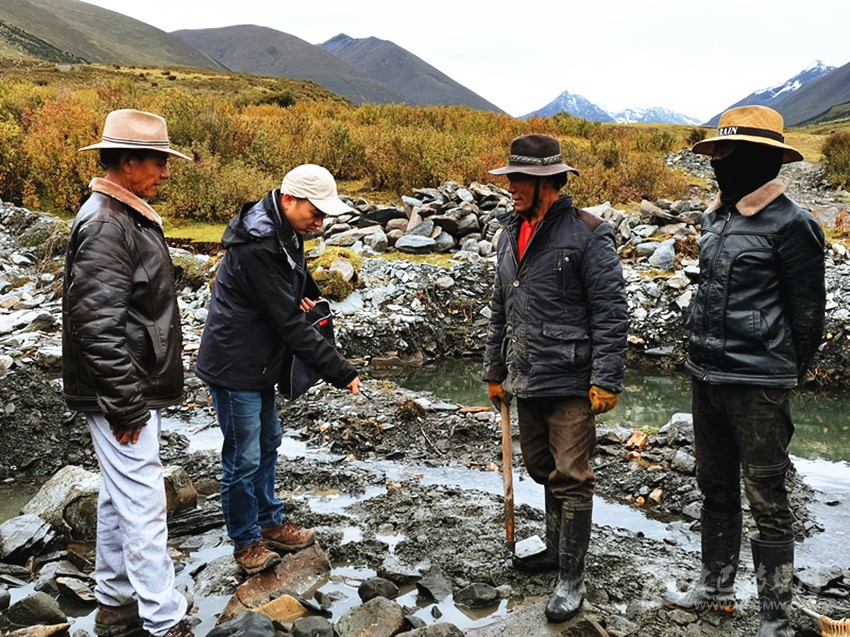 任剛和村民商議修建蟲(chóng)草山便橋橋墩基腳。