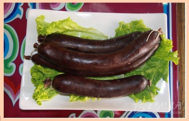 血腸:是將宰殺牲畜的血與玉米面或麥面、蕎面混合在一起,再加以食鹽、花椒面等香料提味,然后將混合物裝進(jìn)洗干凈的牲畜腸里,人鍋煮熟即可。吃的時(shí)候,或蒸或烤:蒸則腸衣柔軟很有嚼頭;烤則腸衣香脆可口。因?yàn)檠c不能長時(shí)間保存,所以吃血腸的時(shí)間一般在宰殺牲畜的幾天內(nèi)。