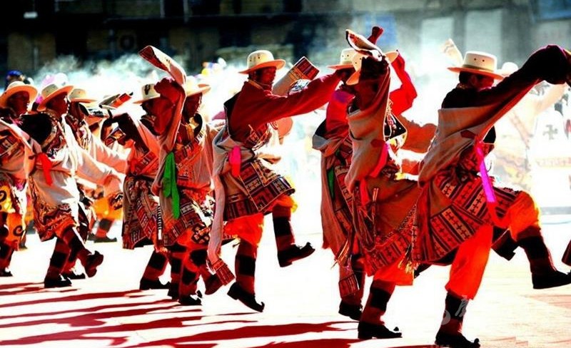 鍋莊有較嚴格的程式,首先由老年領(lǐng)舞、獻酒和哈達。鍋莊舞開始后,由男隊領(lǐng)頭,中、老年女隊隨后,青年女子最后。男隊領(lǐng)舞者必須是德高望重、能歌善舞的長輩,整個舞蹈過程中以他為指揮。鍋莊組織者排在第二位,主要是領(lǐng)唱。男女兩隊圍繞中心反復(fù)旋轉(zhuǎn),呈現(xiàn)多種隊形,其中以嘉旋圖(八卦旋圖)隊形最具特色,造形十分優(yōu)美。